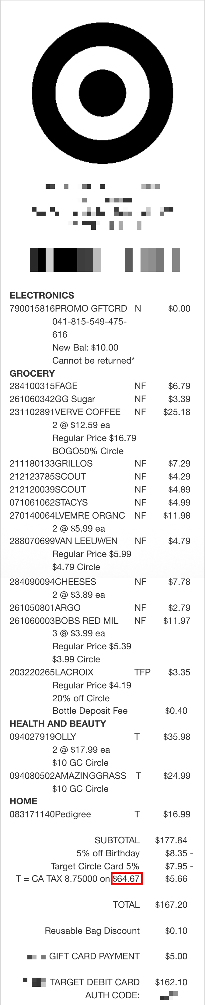 All the information you need is provided on the receipt below (it’s a real receipt I downloaded from my Target account and has not been altered except to blur out some of my personal information).